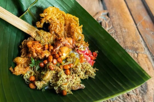 Menu yang disajikan juga beragam namun juga sederhana seperti nasi campur khas Bali dengan sajian lauk lawar biu batu, serapah ayam, sambal bali, kacang goreng, ayam panggang dan kuah ares.